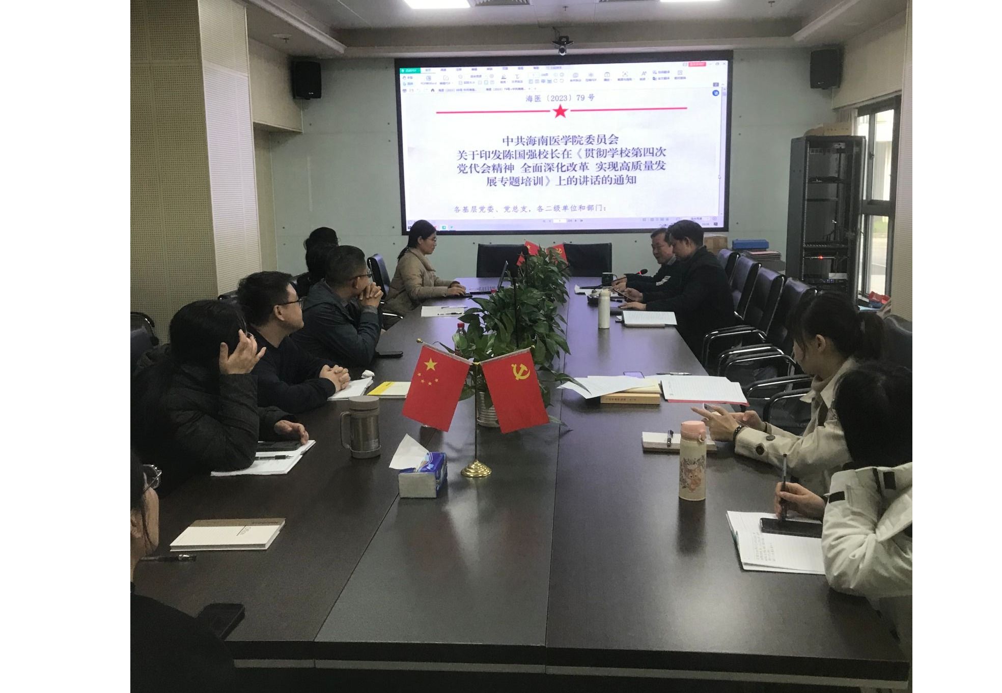 首先曾武书记领学《中共海南医学院委员会关于深入学习宣传贯彻学校第四次党代会精神的通知》;并提出要求;接着田树红副主任领学陈国强校长在《贯彻学校第四次党代会精神 全面深化改革 实现高质量发展专题培训》上的讲话:《海南医学院深化改革高质量发展若干措施》;黄绵庆老师领学《习近平著作选读》第二卷—开展党史学习教育要突出重点。