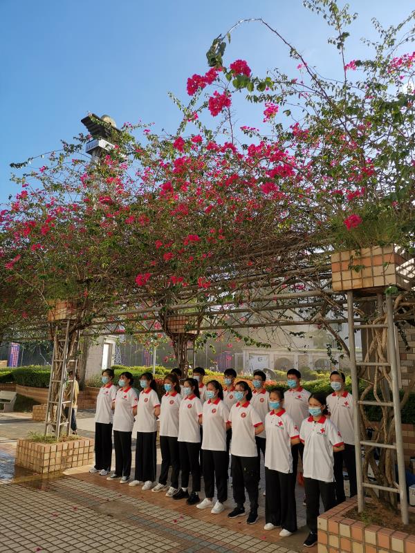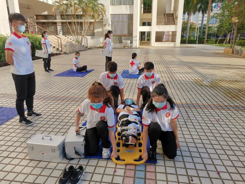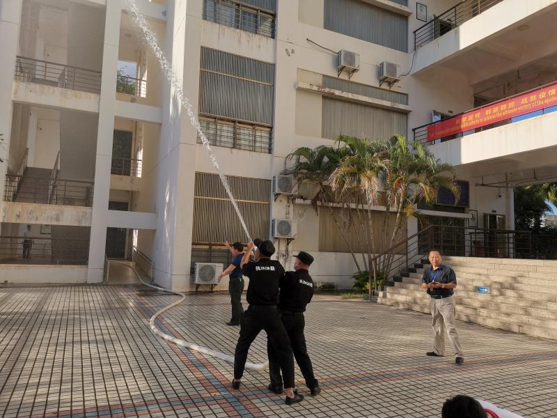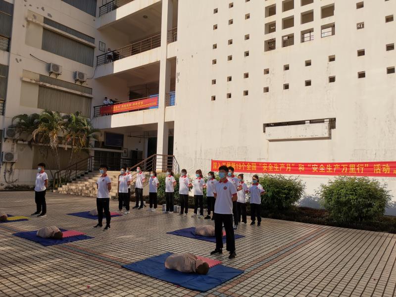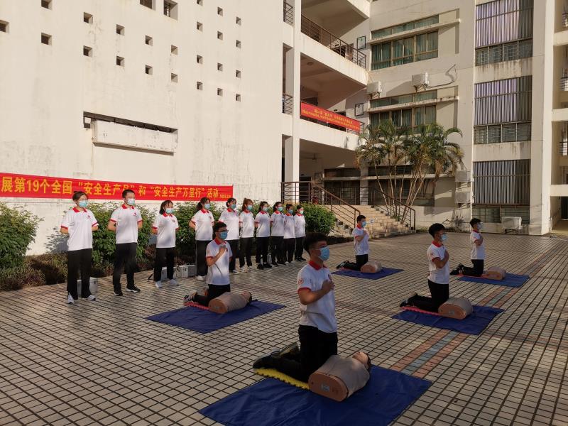 2020年6月11日下午5时30分第二教学楼突然浓烟滚滚、疏散警报响起,部分老师和同学用湿毛巾捂嘴弯腰跑到安全地带,学校物业公司的义务消防队员向同学们讲解了灭火器、消防栓的使用方法并演示了利用消防水带扑灭火灾的规范程序和动作;学校红十字会的几十名同学现场讲解并演示应急救护、心肺复苏、救护包扎等知识。