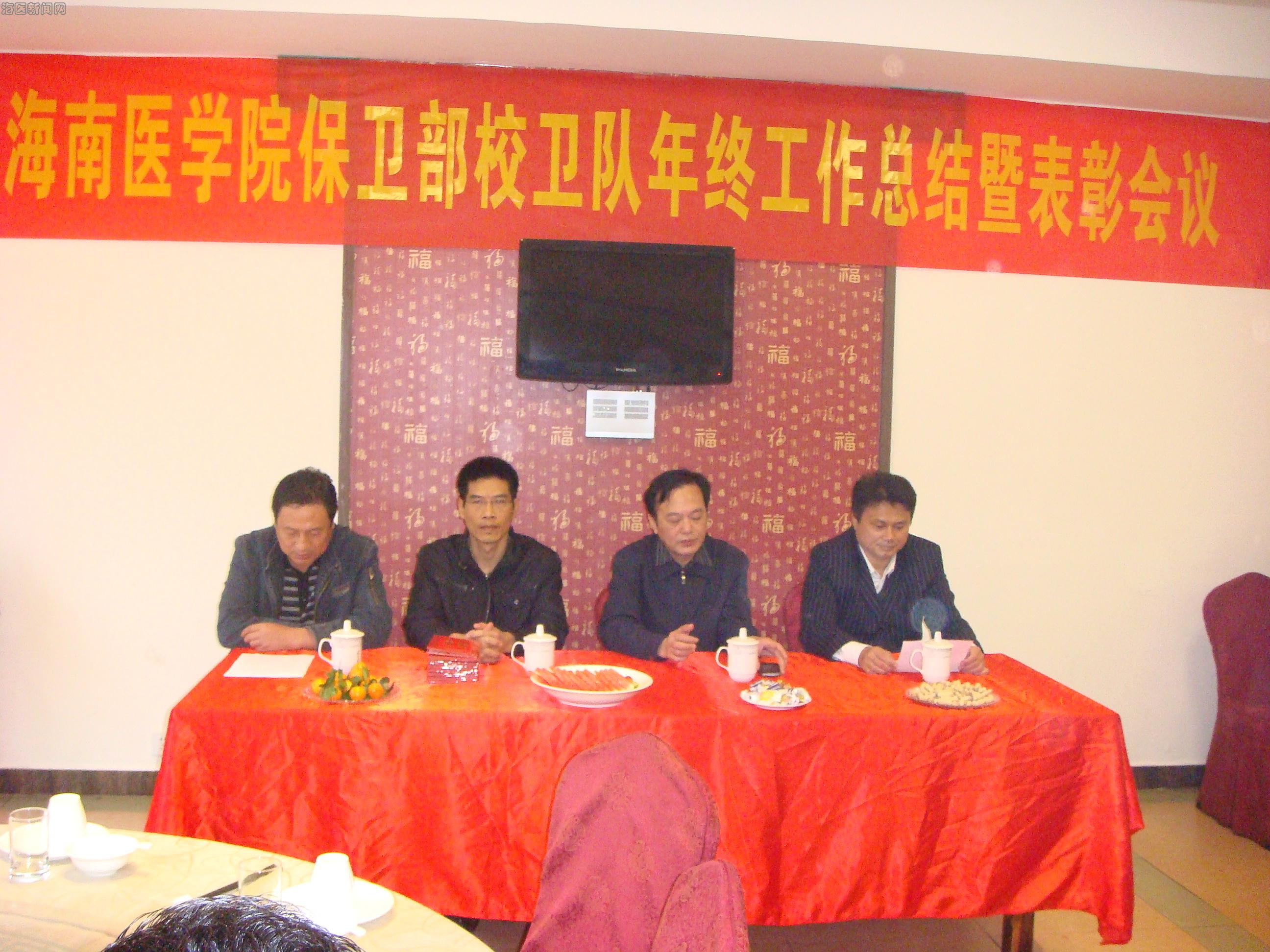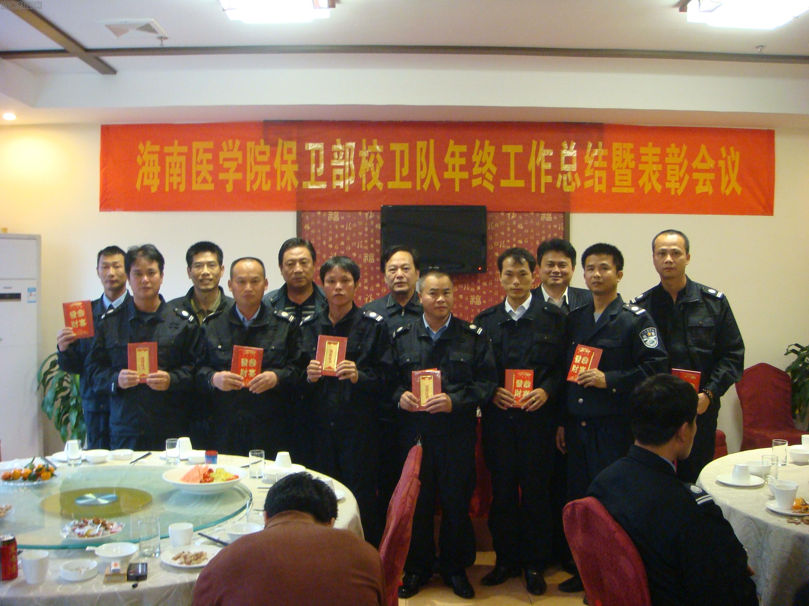 12月26日下午,海南医学院保卫(武装)部2011年度校卫队年终工作总结暨表彰会议在海口湘味苑酒店举行。2011年,在校领导的关心和保卫部直接领导下,在全体师生员工的大力支持和帮助下,校卫队全体队员一年来辛勤劳动和努力工作,为学校广大师生营造了一个良好的教学、科研和生活的环境。