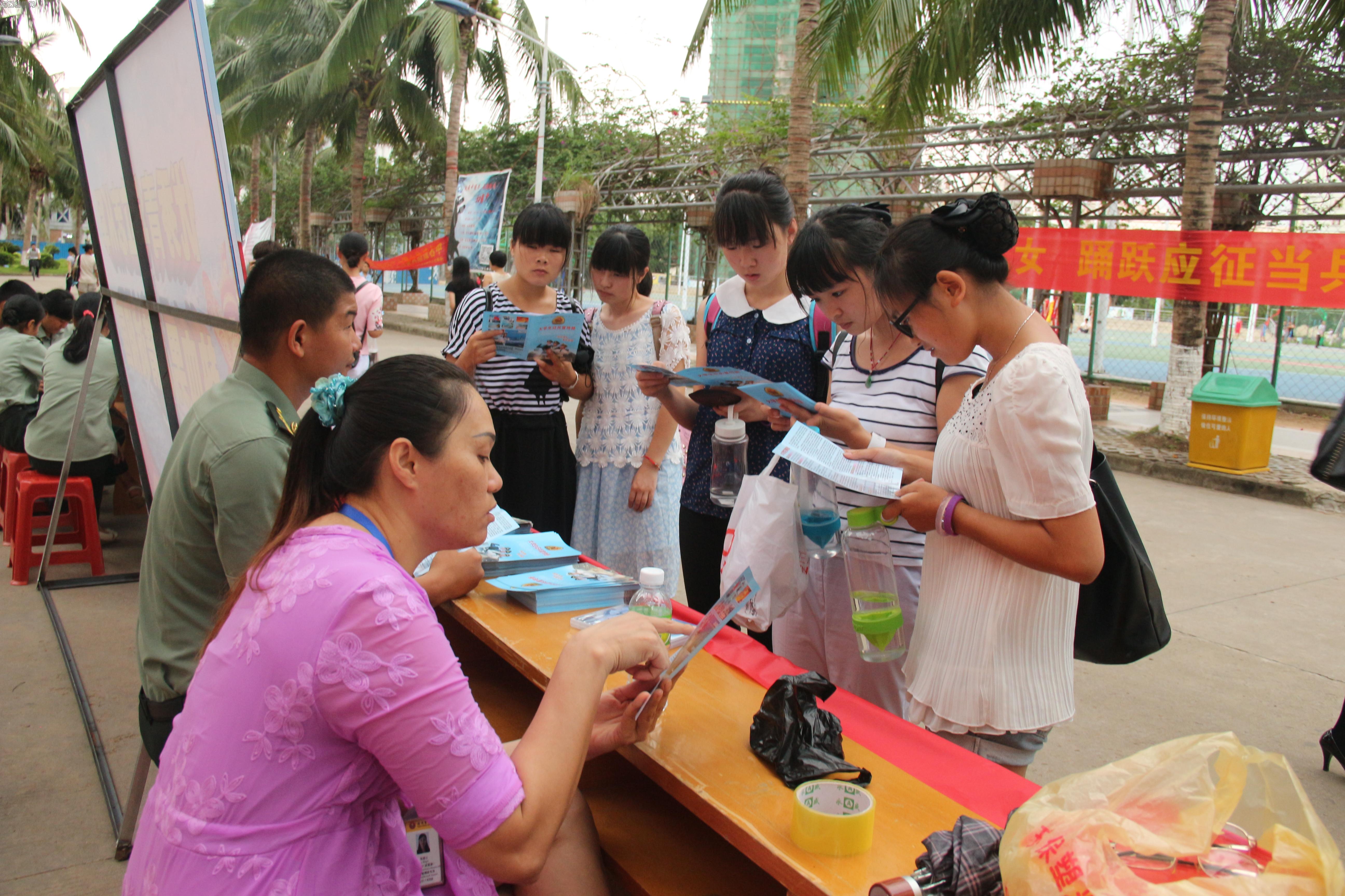 2015年5月21日下午,为提高兵源质量,吸引更多的大学生参军入伍,海口市龙华区人民政府征兵办公室协同taptap点点武装部,在风雨操场旁开展了大学生征兵宣传活动。龙华区武装部政委梁双喜,校武装部部长谭美权,副部长梁昌联,科长吴清云、尚明洪、黄宏炎与十余名征兵办办公室成员现场指导工作开展。