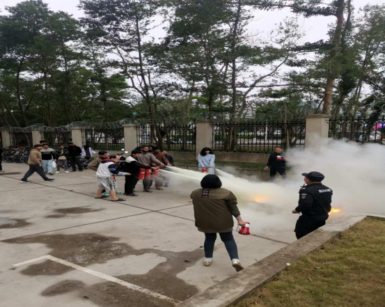 最后,叶康老师现场教参训人员灭火器的使用方法。灭火器的使用就五个步骤,一提起灭火器,二拔出保险销,三抓住灭火器喷嘴前端,四按下压把,五对准火点灭火。为了演练达到真实效果,我们设置了一个油锅火灾点。根据叶康老师的讲解,参训人员使用干粉灭火器,模拟救火场景轮流进行灭火演练。