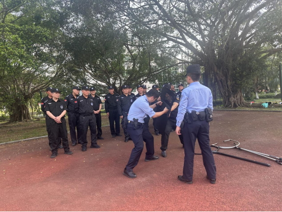 演练开始前,城西派出所的警官们凭借丰富的实战经验,深入浅出地为安保人员讲解了反恐演练的关键技能要点。对现有的防护盾牌、警棍、安全钢叉等防暴器械的使用警官们都进行了细致入微的现场模拟讲解。通过生动的演示和耐心的指导,确保每一位安保人员都能清晰理解并熟练掌握这些装备和器械的操作要领。