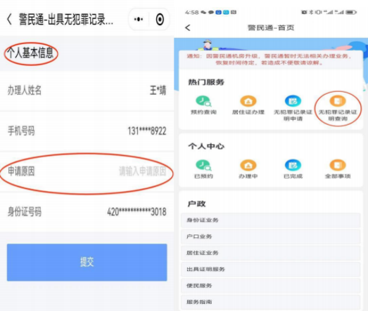 5. 点击“开始办理”后会弹出“个人基本信息”个人只须要填写“申请原因”即可,填写完 后点击“提交”,提交完后会在 2 到 3 个工作日内出结果,结果可以在“警民通—首页”中 的“无犯罪记录证明查询”处查询
