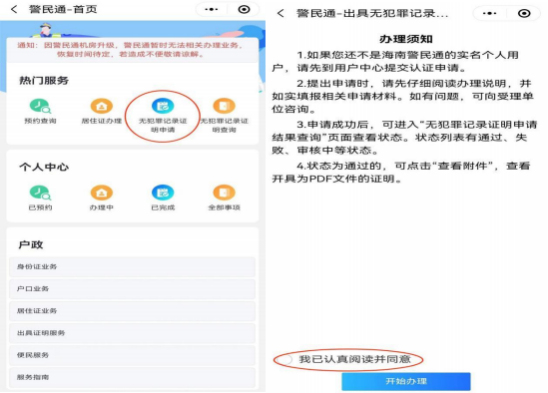 4.点击“登录”后将进入“警民通—首页” ,在“警民通—首页”点击“无犯罪记录证 明申请”会弹出“办理须知”在“我已认真阅读并同意”前◯内打√ ,然后点击“开始 办理”