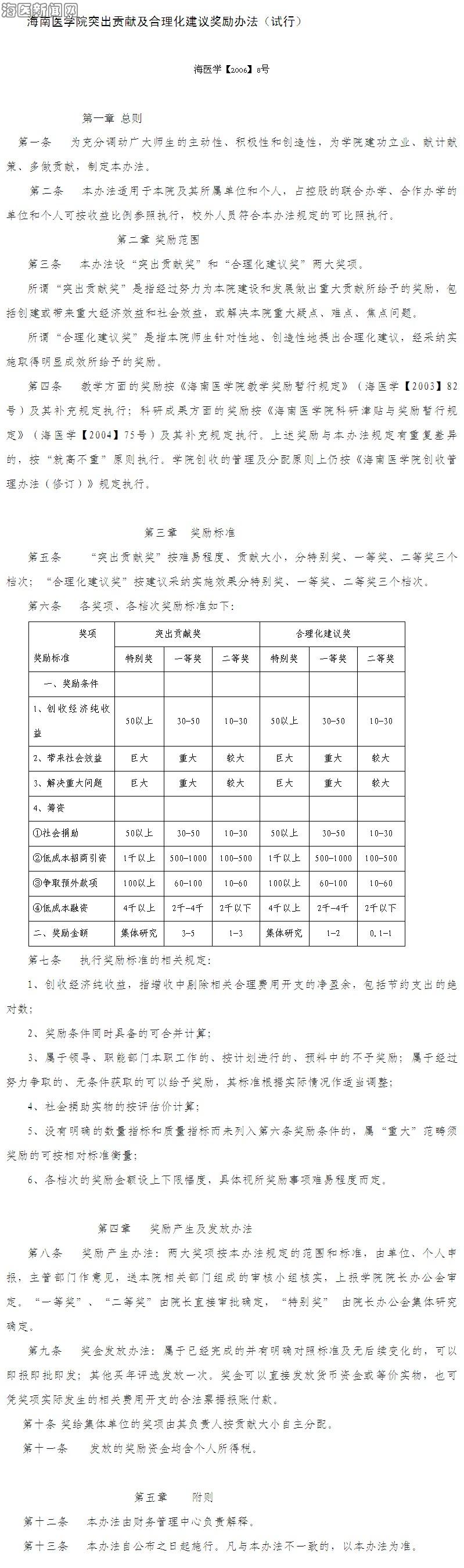 《海南医学院突出贡献及合理化建议奖励办法(试行)》
