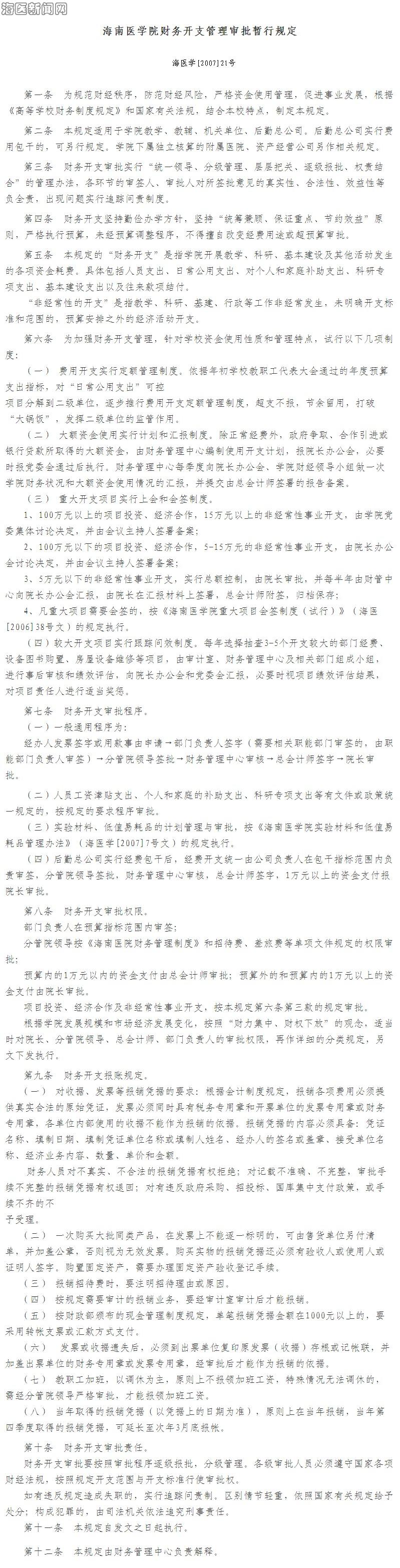 《海南医学院财务开支管理审批暂行规定》