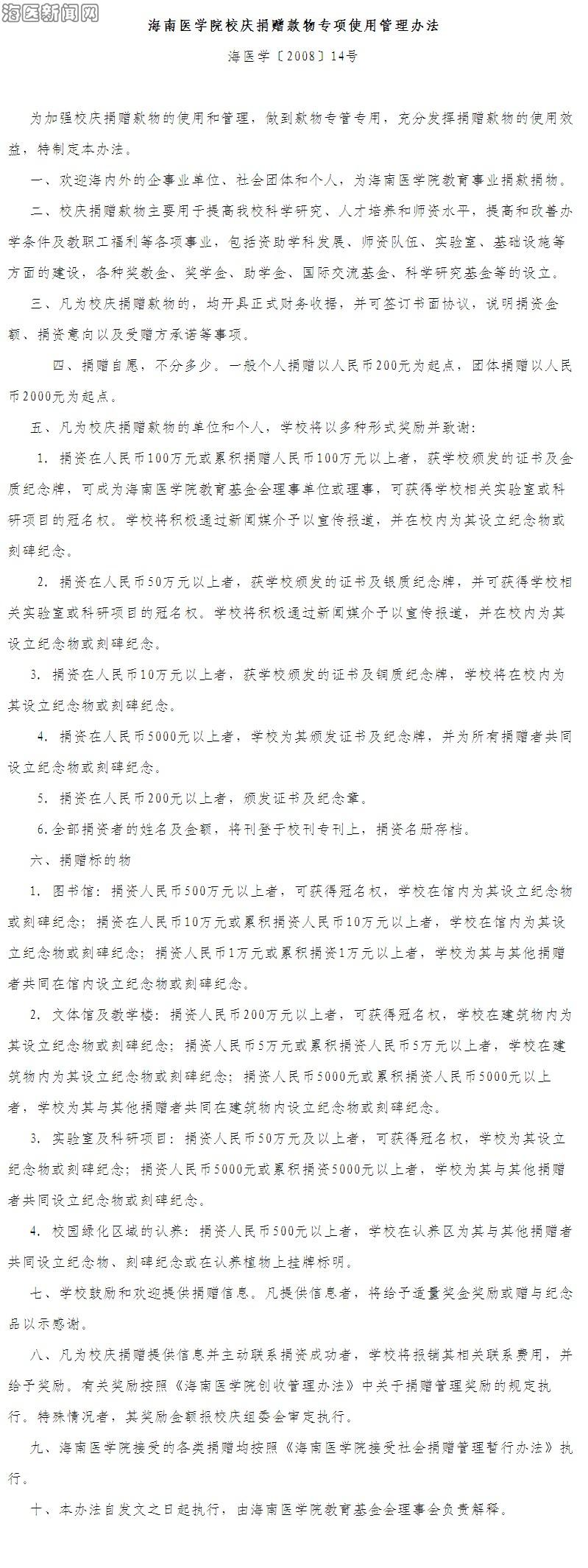 《海南医学院校庆捐赠款物专项使用管理办法》