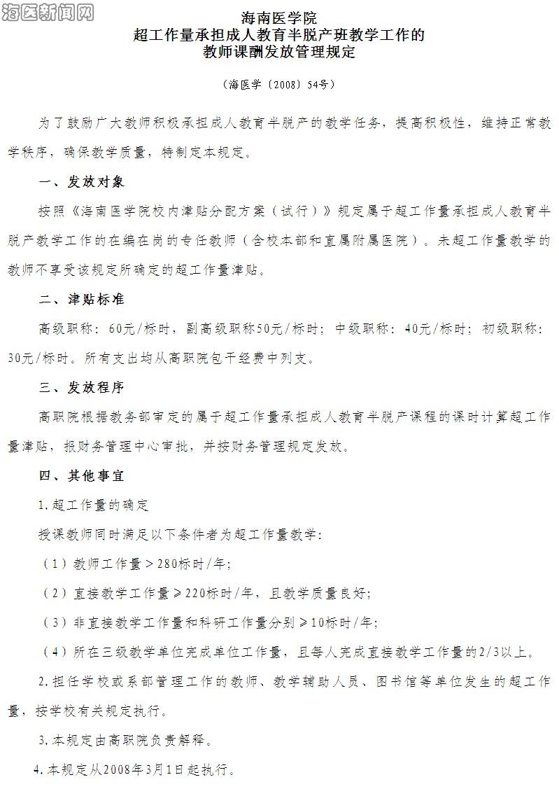 《海南医学院超工作量承担成人教育半脱产班教学工作的教师课酬发放管理规定》