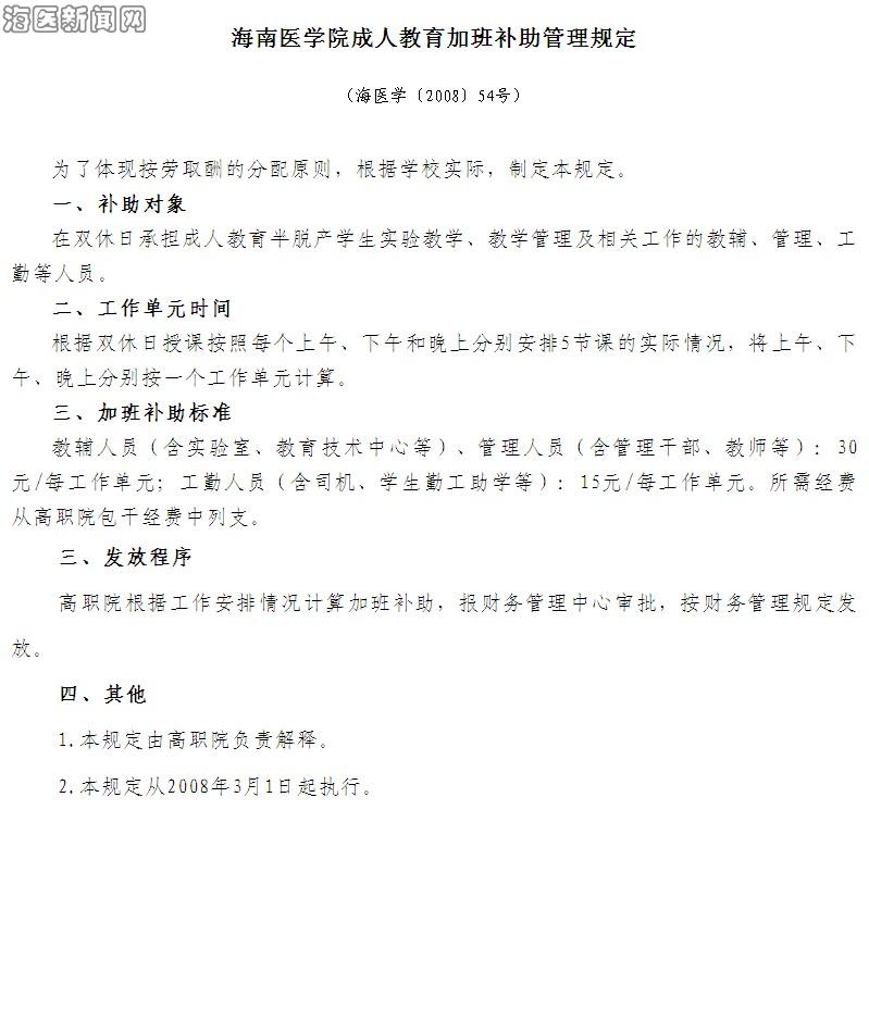 《海南医学院成人教育加班补助管理规定》