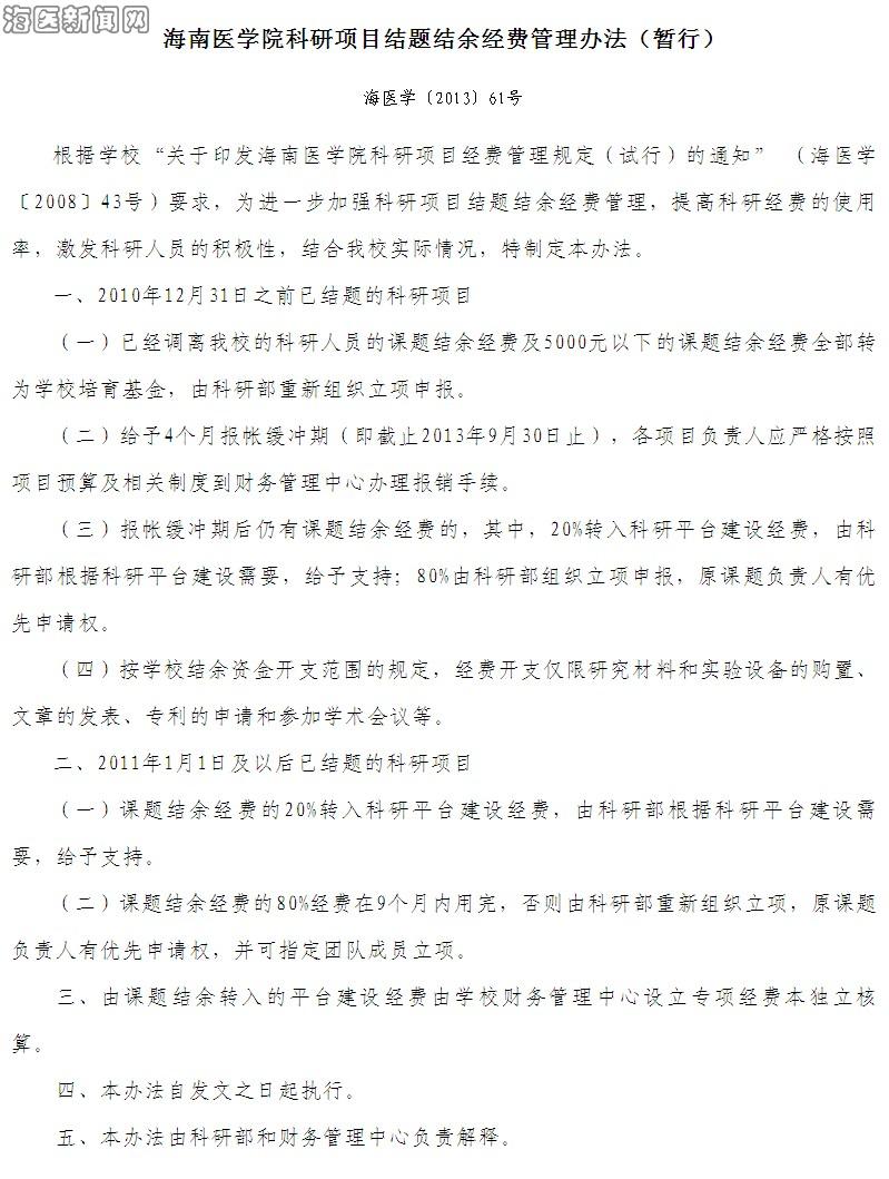 《海南医学院科研项目结题结余经费管理办法(暂行)》