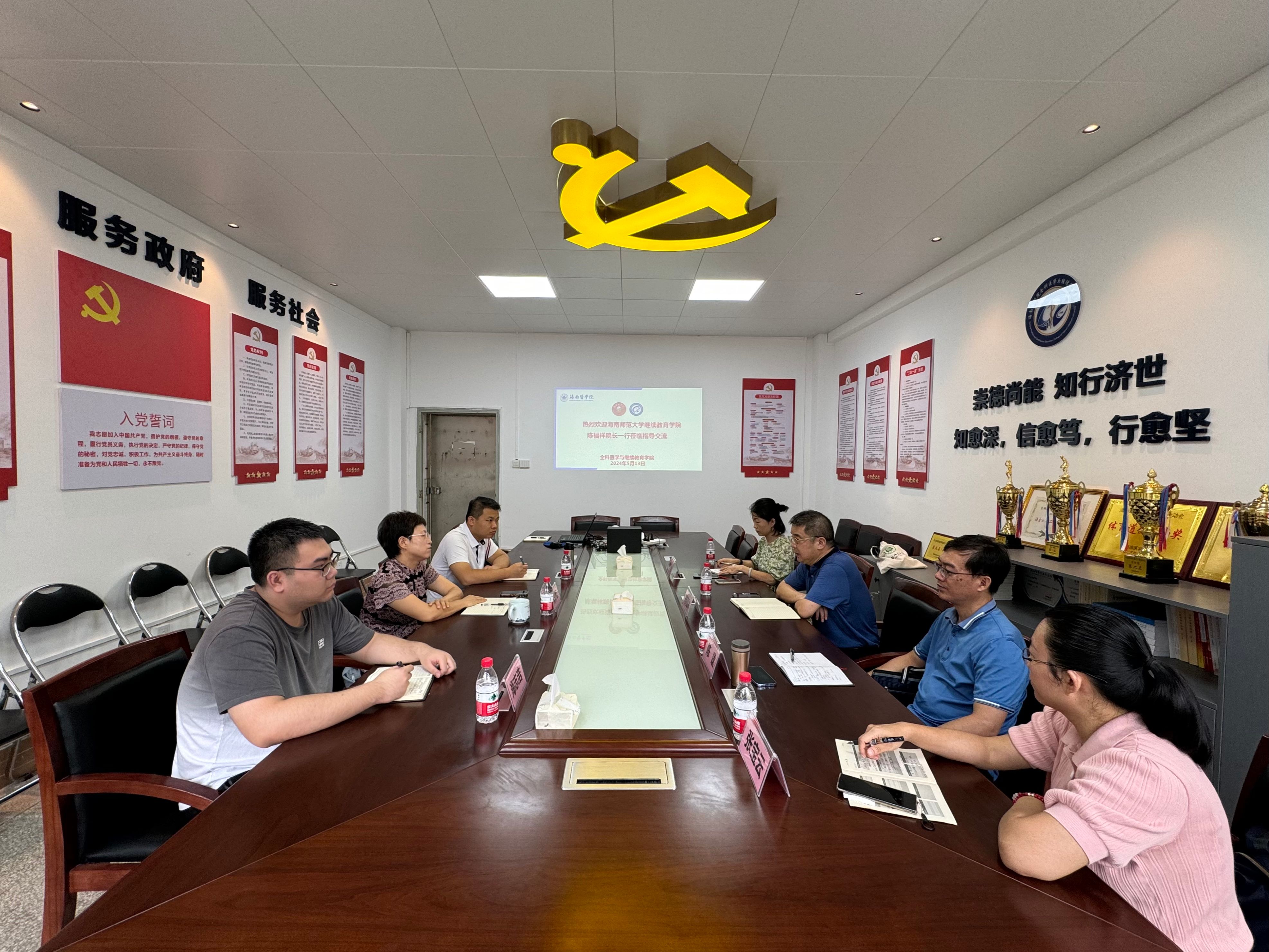 5月13日上午,海南师范大学继续教育学院院长陈福祥一行4人到我院调研交流。我院院长常彩红、党政办公室负责人王鹏及相关科室负责人参加交流。