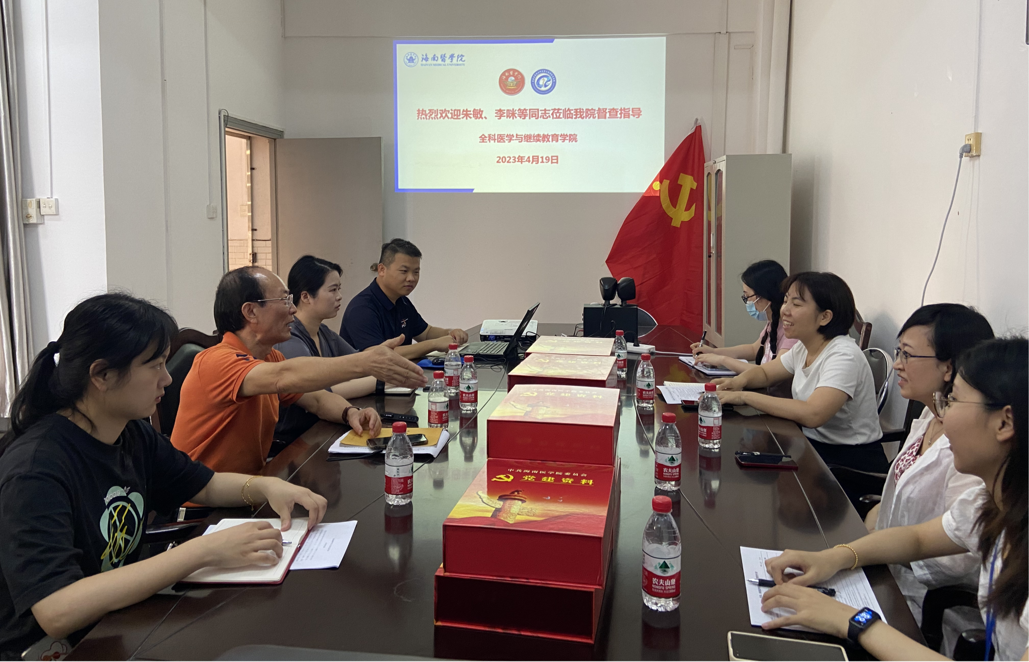 2023年4月19日上午,按照学校统一部署,急诊创伤学院党委副书记朱敏、校宣传部副部长李咪一行4人来我院进行党建工作、宣传思想和意识形态工作督导、考核。我院党委书记王身坚,党委委员、党政办负责人王鹏,教工党支部书记吴頔,团委书记周妮全程陪同。