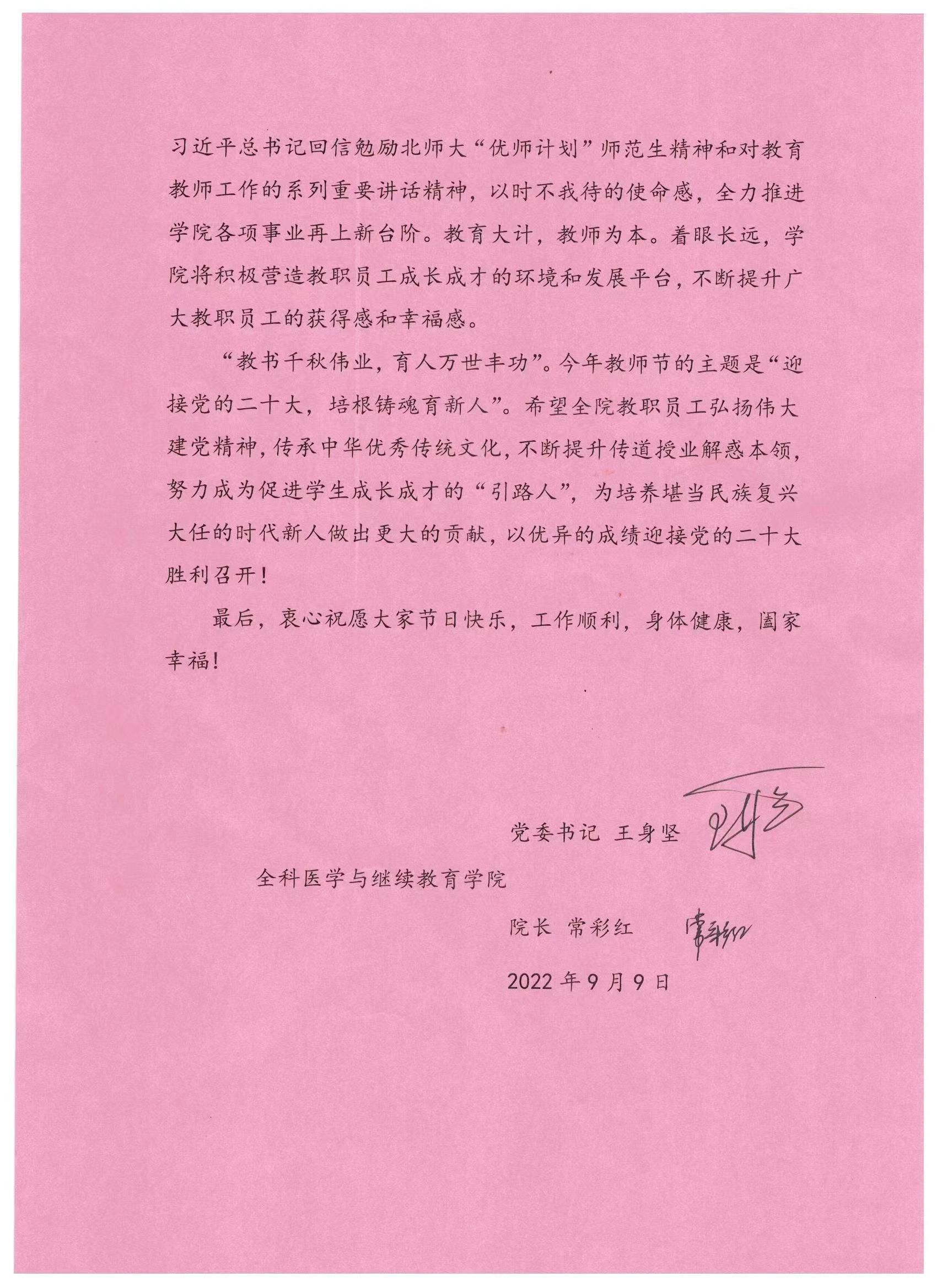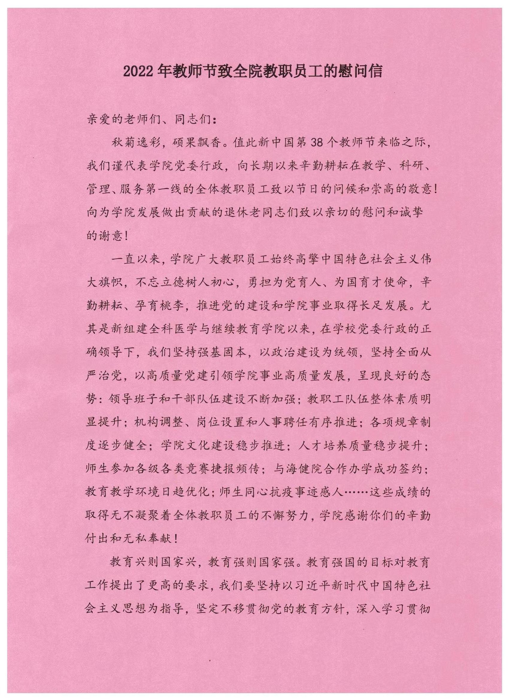 2022年教师节致全院教职员工的慰问信