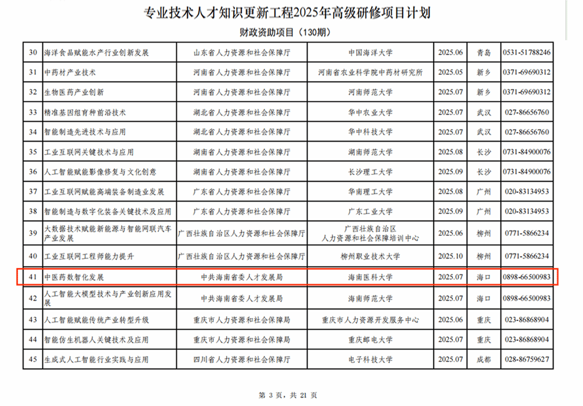 近日,人力资源社会保障部办公厅发布了《人力资源社会保障部办公厅关于印发专业技术人才知识更新工程2025年高级研修项目计划的通知》(人社厅函〔2025〕27号),我院以国家级专业技术人员继续教育基地为依托,牵头组织申报的“中医药数智化发展”高级研修班项目成功入选。