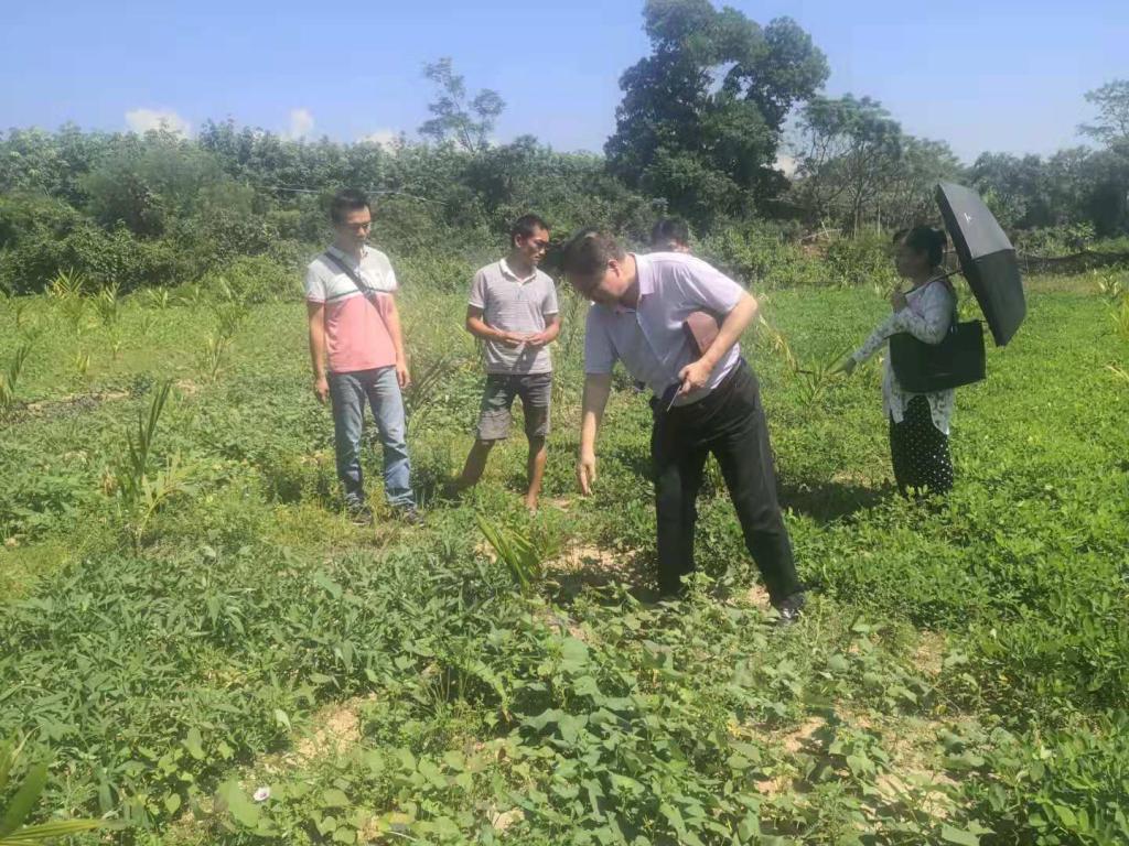 接下来,符章祥带领我们一行来到其自家坡地,视查成人教育学院教工党支部赠与的200棵槟榔苗生长情况。槟榔苗种植已四个月,几乎全部成活,而且长势良好,我们希望符章祥积极管好,让槟榔长势更好,有何困难和问题随时和我们联系。