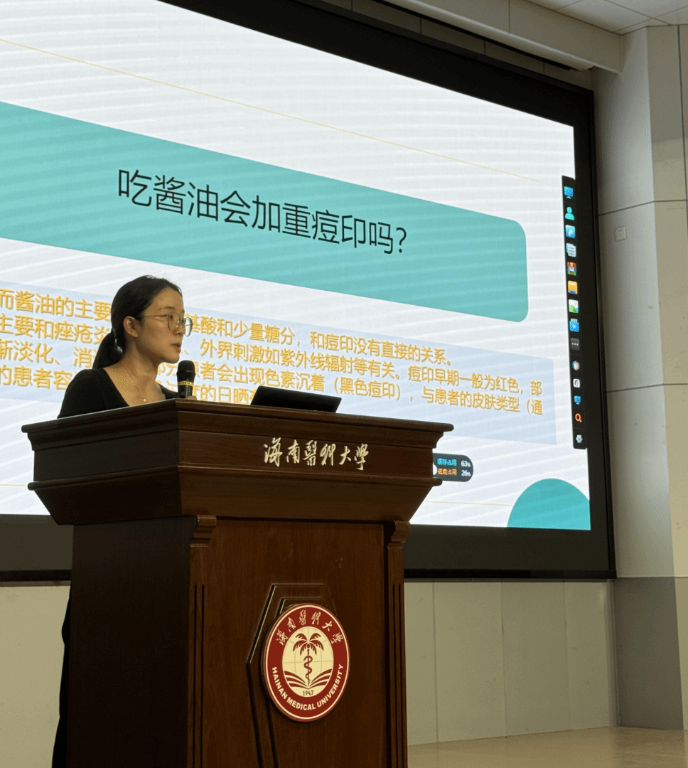 首先,海南省第五人民医院医学美容部的郑小乐医生为同学们详细阐述了痤疮的发病机制。她指出,痤疮的发生与多种因素密切相关,包括内分泌失调、皮脂分泌旺盛、毛囊角化异常以及痤疮丙酸杆菌感染等,同时也讲解了痤疮日常护理过程中的一些常见误区。