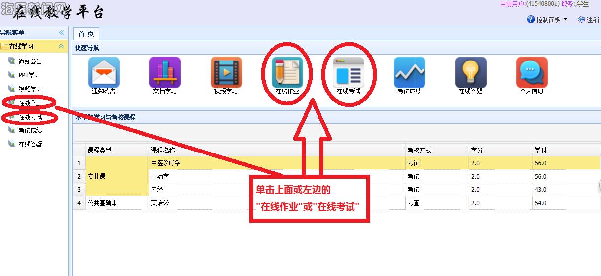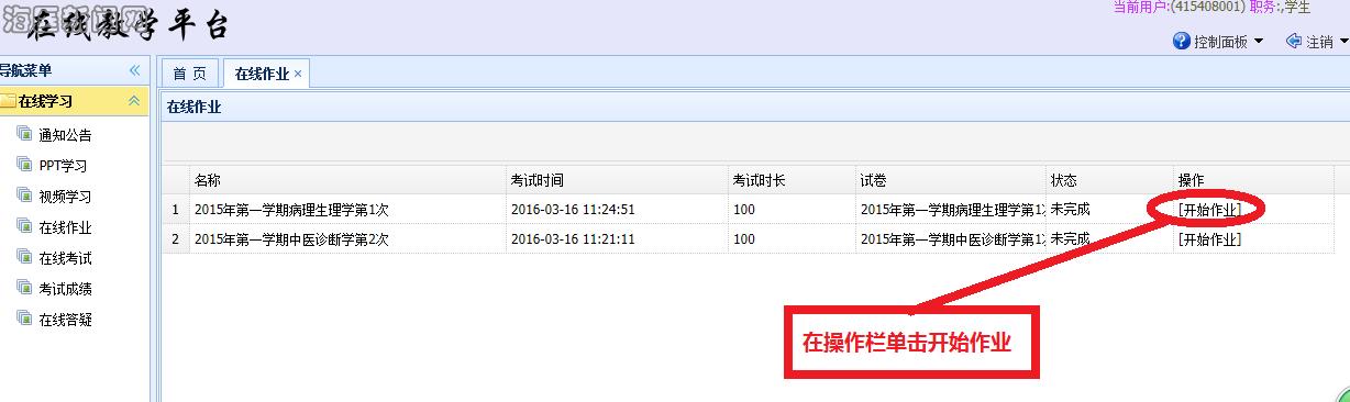 完成输入学号和密码后,在呈现页面的上面或左边均显示有“在线作业”或“在线考试”栏目,学生在任一处根据作业或考试单击进入。