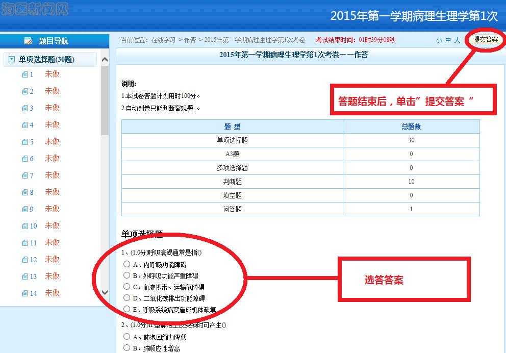 2、第二步:答题结束后,回到右上角,单击“提交答案”,完成作业或考试。(重要提示:提交后不能再重新答题,请同学们认真核对后提交,此外,只要一旦进入作业或考试栏目,必须一次完成,不能重复进入)。