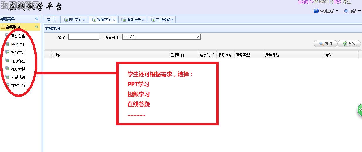 “在线教学平台”除了“在线作业”、“在线考试”功能外,还有“PPT学习”、“视频学习”、“在线答疑”等功能,将逐步开放给学生使用。