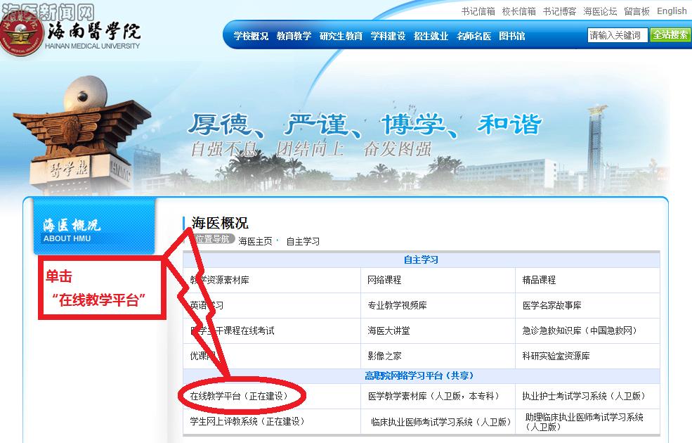 1、第一步:登陆海南医学院校园网,网址:http://www.hainmc.edu.cn/