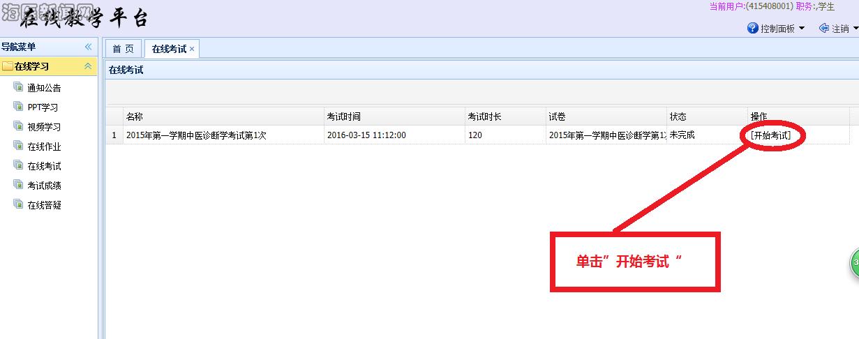 “在线考试”:单击“开始考试”进入考试页面。(见下页,“三、…答题”页面)。