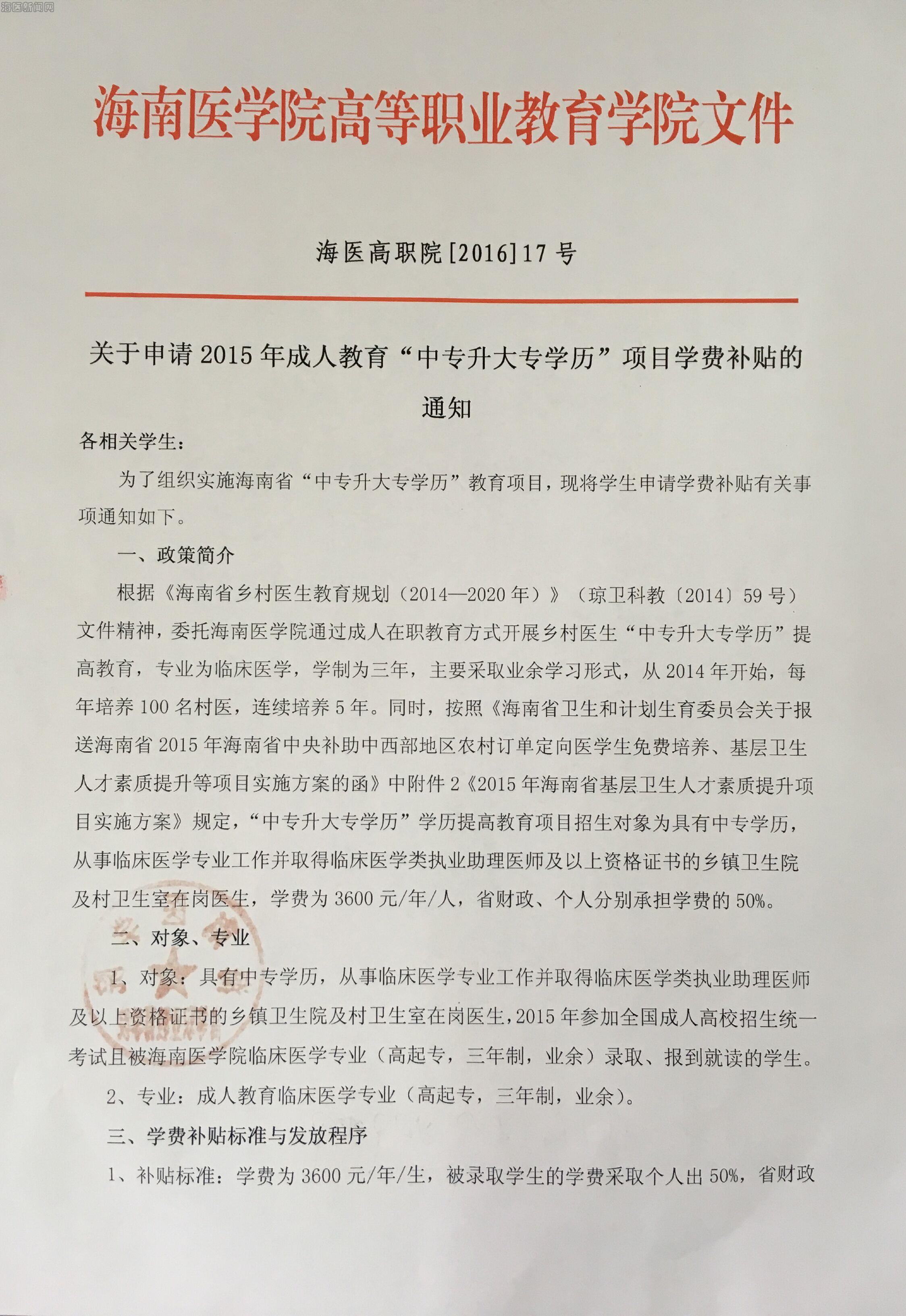 【学费补贴】关于申请2015年成人教育“中专升大专学历”项目学费补贴的通知