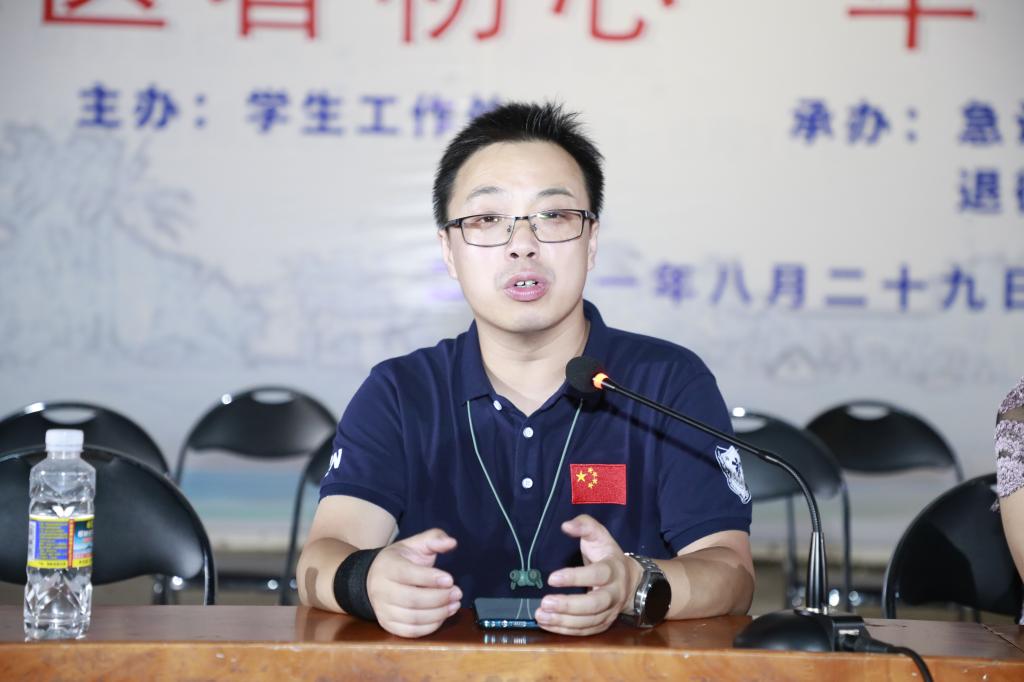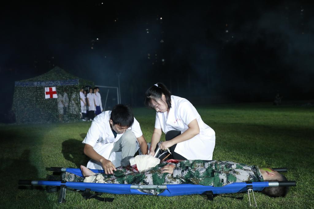 8月29日19:30,海南医学院在城西校区田径运动场举办了2021级新生入学第一课——“灾难意识教育”演习活动。本次活动由学生工作处主办、急诊创伤学院和退役军人事务中心承办。演习活动共分成三幕。