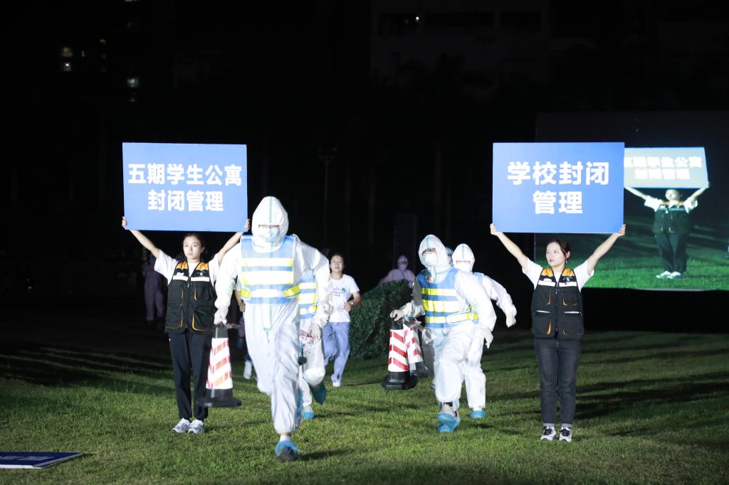 第二幕为“战新冠抗疫情 稳情绪保平安”。当前新冠肺炎德尔塔毒株肆虐,国内新冠疫情也未平息,又面临高校开学季,疫情防控格外重要。演习展现了当阳性病例出现时学校实施疫情防控的各个环节。而作为海南医学院一份子的我们应牢固树立“每个人都是自己健康第一责任人”的理念,切实提高疫情防控意识,做好个人防护措施,对自己和对他人负责。