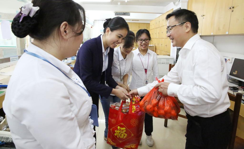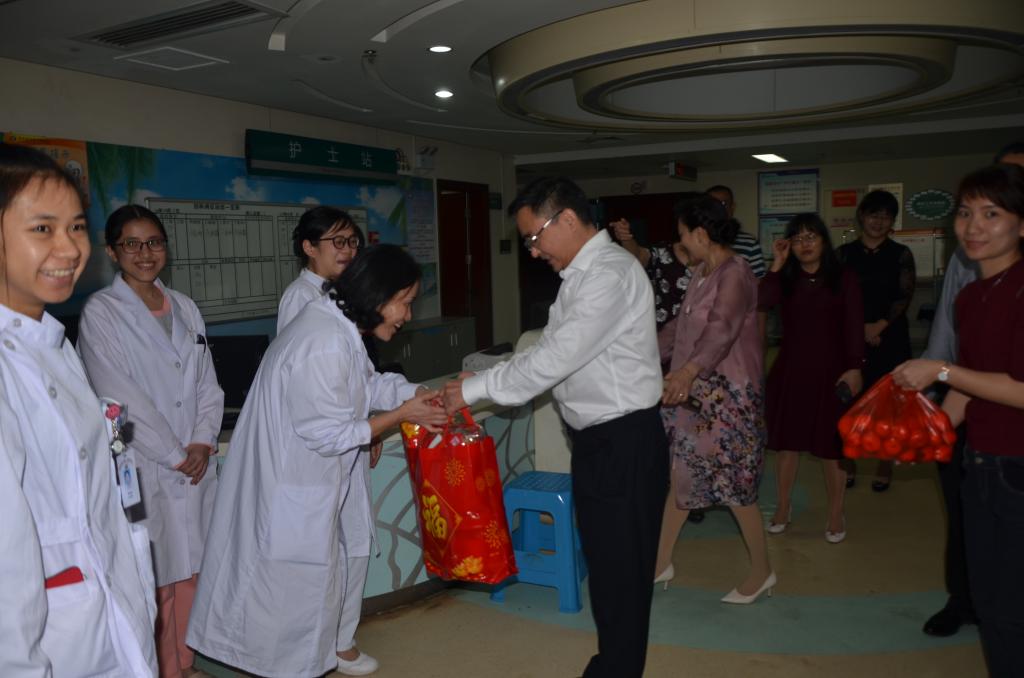 为了给春节期间坚守在一线的医护人员和在院病友送去暖心的新春问候和祝福,受学校党委书记吕传柱和院长杨俊的委托,黄元华副院长于猪年除夕,向伟、张彩虹副院长于大年初一,在王身坚、郑武平、李果果、肖红秀等职能部门负责人的陪同下,分别深入到附属海南医院、第二附属医院、第一附属医院、附属肿瘤医院,走访了相关科室,看望慰问临床一线值班人员和在院患者,代表学校党委和行政向他们致以节日的问候和良好的祝福!