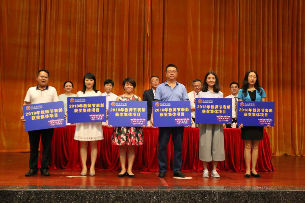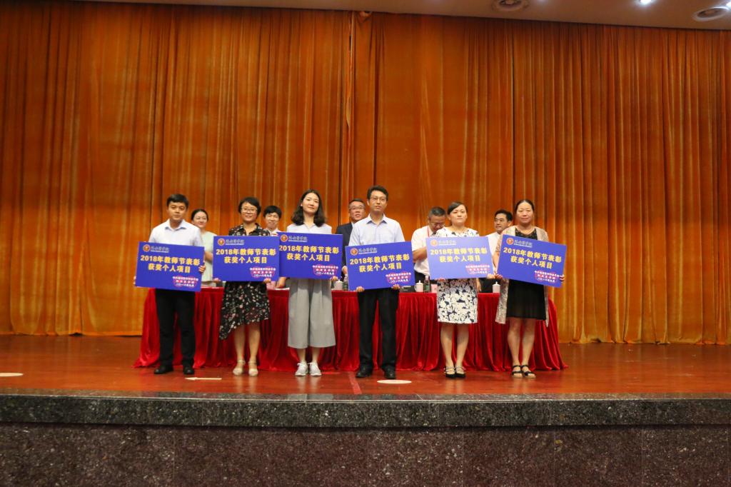 黄元华副院长宣读学校对2017-2018学年度教学、科研及学科建设中表现突出的集体和个人进行表彰的决定,随后,在主席台就座的各位领导向荣获科研类奖项、教学类奖项、学工类奖项、共青团类奖项、行政类奖项、教研所类奖项的集体奖项代表和个人奖项代表颁奖。大会还向从事教育工作满30年的岑桑、赵志勇、宋勇、李春花、李伟、刘启昌、韩祥畴、陈正蓉、张经能等9位职工和在教学一线工作满30年的庄宇、戴吉福、郝恩宪、陈桂敏、谭光宏、冯志成、吕刚、郑文芝等8位教师进行表彰.