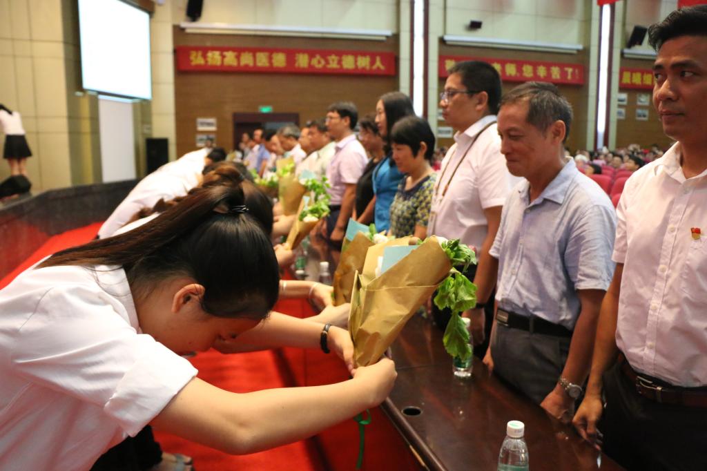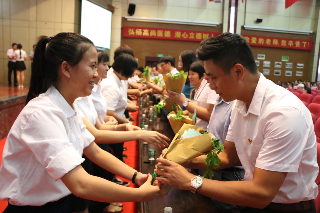 由急诊创伤学院的同学们自编的“谢师礼”,将教师节庆祝大会推向了高潮。“谢师!”随着主持同学的话音,百余名学生齐刷刷深躬90度,随后送上自己亲手制作的精美的特殊谢师“礼物”,向在座的老师代表表达敬仰和感恩之情。