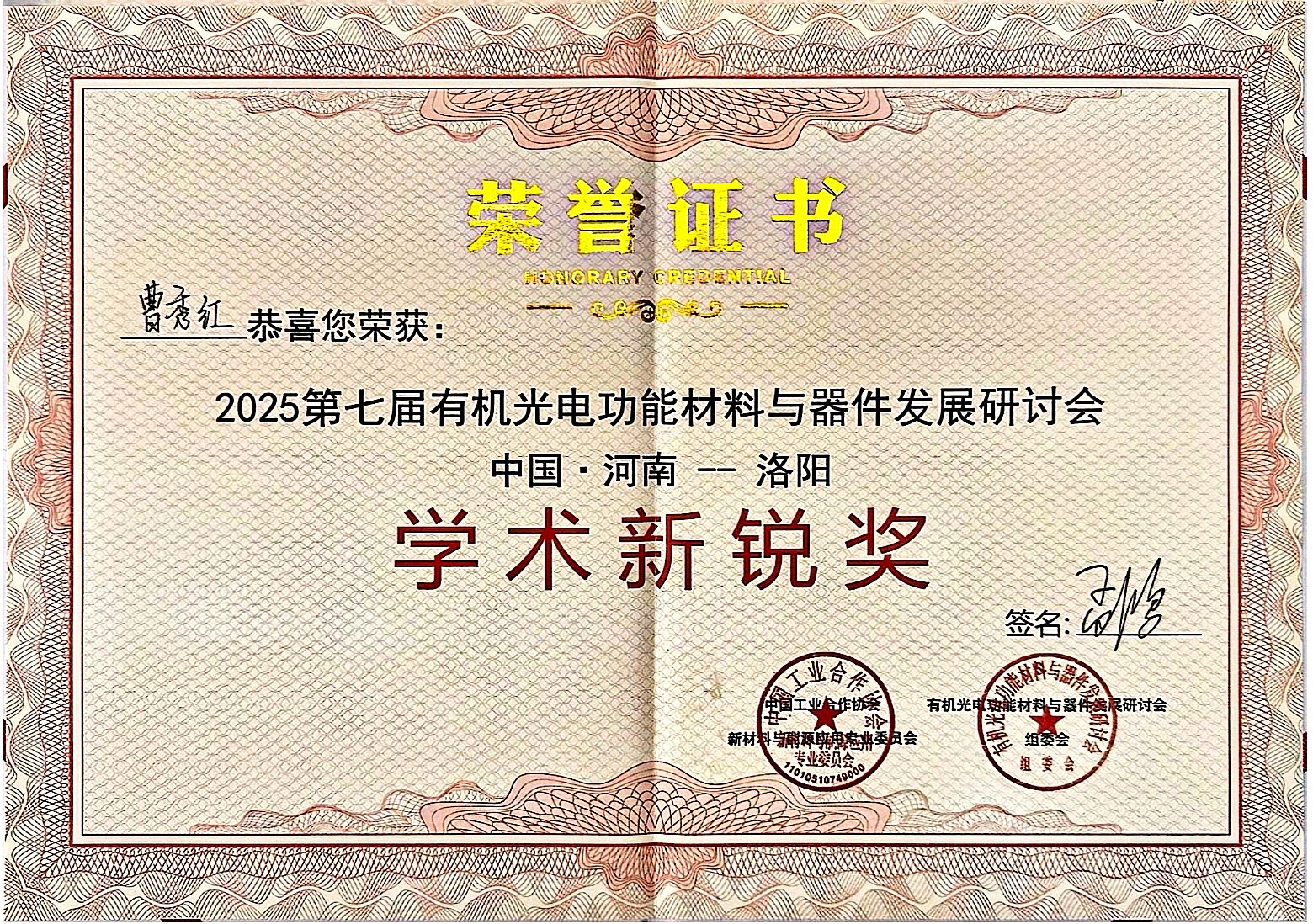 祝贺我室硕士研究生曹秀红获得2025第七届有机光电功能材料与器件发展研讨会学术新锐奖
