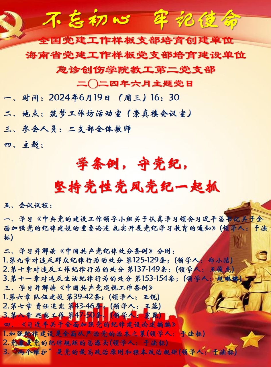 二〇二四年六月主题党日:学条例,守党纪, 坚持党性党风党纪一起抓