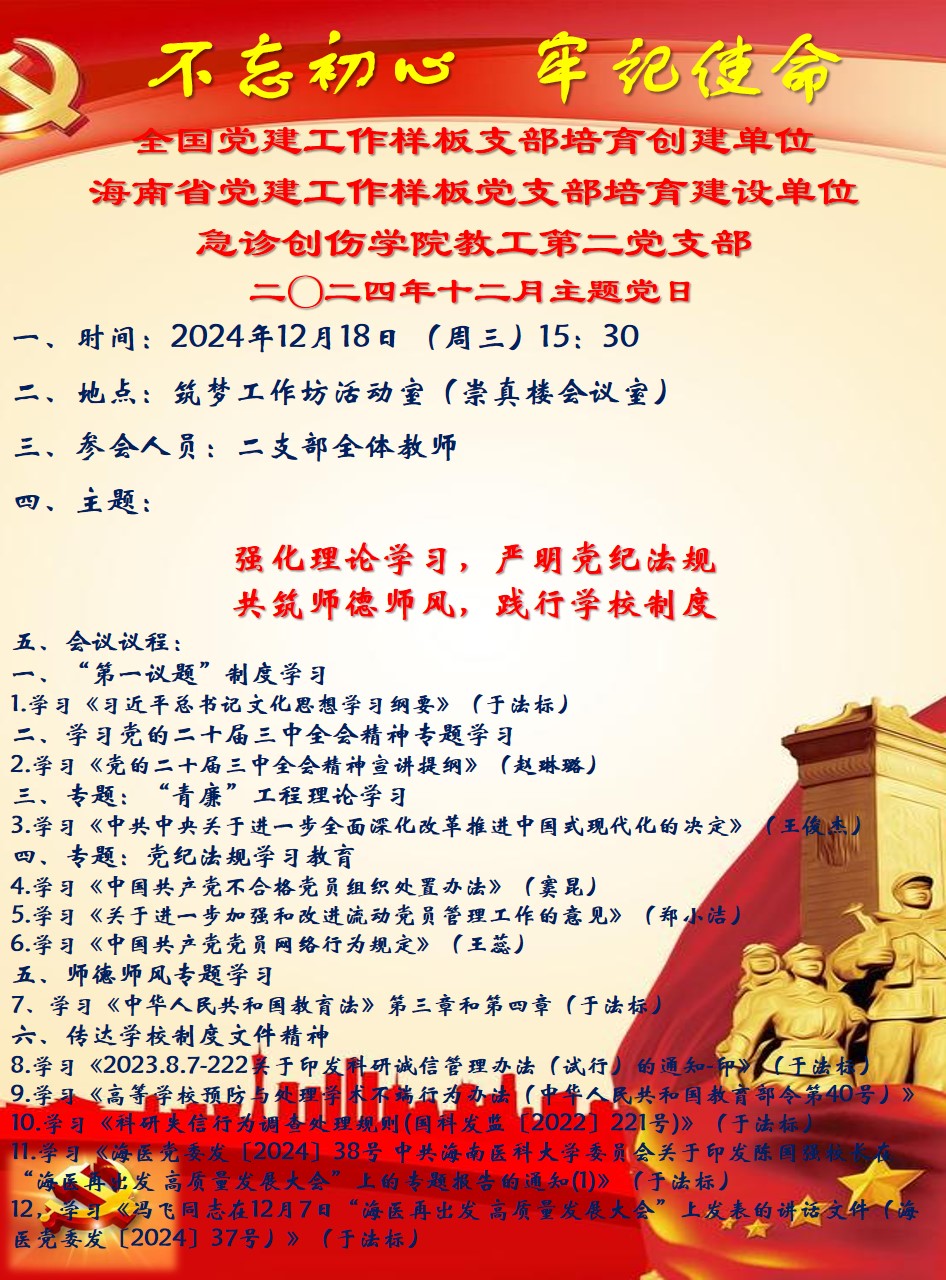 二〇二四年十二月主题党日:强化理论学习,严明党纪法规 共筑师德师风,践行学校制度