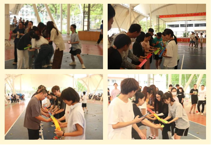 随着主持人发表了慷慨激昂的开幕词后,本次联谊活动正式拉开序幕,第一比赛为“珠行万里”,同学们默契的用U槽传球,用力奔跑,共同奔向终点。
