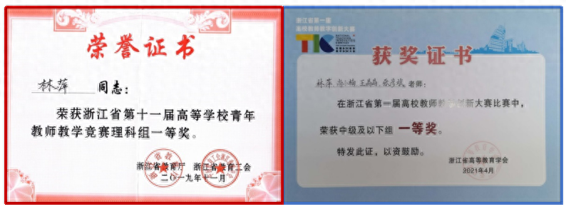 以赛促教,以研促教,教研结合提升教学水平。近两年团队教师获浙江省高等学校青年教师教学竞赛理科组特等奖、一等奖各1项;获浙江省第一届高校教师教学创新大赛一等奖1项。
