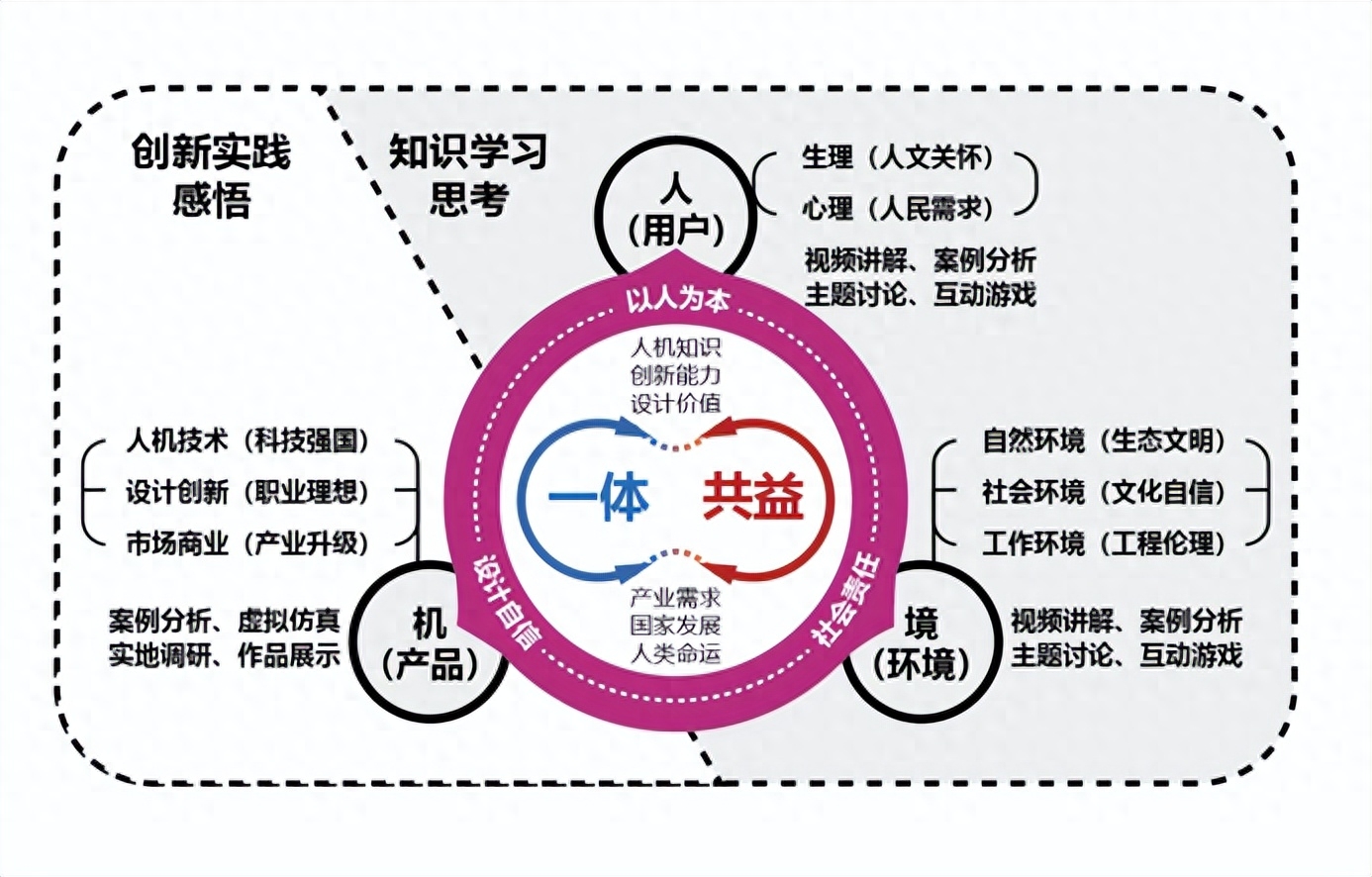 课程旨在培养掌握人机工程学基础理论与设计方法,并能综合应用于项目设计实践,服务并引领行业发展,具有国际视野、人文关怀和社会责任感的复合型创新人才。同时课程以创造 “人-机-环境”系统和谐关系的目标为导向,同步构建【一体共益】课程思政核心与育人目标。