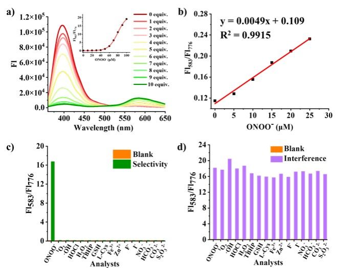 Figure 2. (a) Fluorescence spectra of HBT-Fl-BnB upon the addition of ONOO− (0‒100 μM), inset: the ratio of FI583/FI396 vs. ONOO− (0.0-100 μM); (b) Linearity for the ratio of FI583/FI396 vs. ONOO− concentrations (0.0-25 μM); Fluorescent intensity ratio (FI583/FI396) of HBT-Fl-BnB upon (c) adding ONOO− or other interfering analytes respectively, and (d) adding ONOO− in the presence of competitive analytes. Test conditions: 10 μM HBT-Fl-BnB, and 10 mM PBS buffer with 5% THF, 0.2% Tween, pH = 7.4, λex = 340 nm). Other interfering analytes: ONOO‒, 1O2, ·OH, HOCl, H2O2, NO, TBHP, GSH, L-Cys, Sec, Cys-SSH, Fe3+, Zn2+, F‒, I‒, SO42‒, NO2‒, HCO3‒, CO32‒ and S2O32‒.