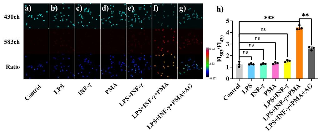 Figure 5. Confocal fluorescence imaging of Raw264.7 cells. (a) Control group: cells were only incubated with HBT-Fl-BnB. Cells were stimulated with different stimuli: (b) LPS (1 μg/mL); (c) IFN-γ (50 ng/mL); (d) PMA (10 nmol/L); (e) LPS (1 μg/mL) + IFN-γ (50 ng/mL); (f) LPS (1 μg/mL) + IFN-γ (50 ng/mL), then with PMA (10 nmol/L); and (g) AG (1 mmol/L) + LPS ( 1 μg/mL) + IFN-γ (50 ng/mL), then with PMA (10 nmol/L); then were further incubated with HBT-Fl-BnB. 430ch: λem= 415-515 nm, 583ch: λem=550-650 nm. Ratio images generated from 583ch/430ch. λex=405 nm, scale bar: 20 μm. (h) Normalized average fluorescence intensity of Fl583/Fl430. ** P<0.01 *** P<0.001. The experiments were repeated three times and the data were shown as mean (±S.D.).