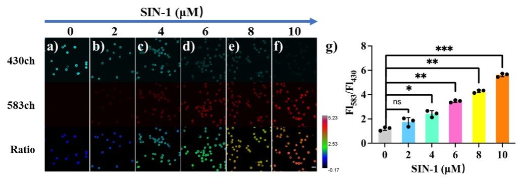 Figure 4. Confocal fluorescence imaging of Raw264.7 cells. Cells were stimulated with different concentrations of ONOO−, (a) 0; (b) 2); (c) 4); (d) 6; (e) 8 and (f) 10 μM, then with HBT-Fl-BnB. 430ch: λem= 415-515 nm, 583ch: λem=550-650 nm. Ratio images generated from 583ch/430ch. λex=405 nm, scale bar: 20 μm. (g) Normalized average fluorescence intensity of Fl583/Fl430. * P<0.05, ** P<0.01 *** P<0.001. The experiments were repeated three times and the data were shown as mean (±S.D.).