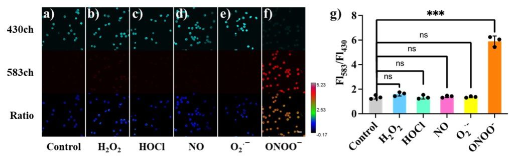 Figure 3. Confocal fluorescence imaging of Raw264.7 cells. (a) Control group: cells were only incubated with HBT-Fl-BnB. Cells were stimulated with exogenous ROS/RNS: (b) H2O2; (c) HOCl; (d) NO; (e) O2·−; (f) ONOO− (10 μM in PBS buffer), then with HBT-Fl-BnB. 430ch: λem= 415-515 nm, 583ch: λem=550-650 nm. Ratio images generated from 583ch/430ch. λex=405 nm, scale bar: 20 μm. (g) Normalized average fluorescence intensity of Fl583/Fl430. *** P<0.001. The experiments were repeated three times and the data were shown as mean (±S.D.).