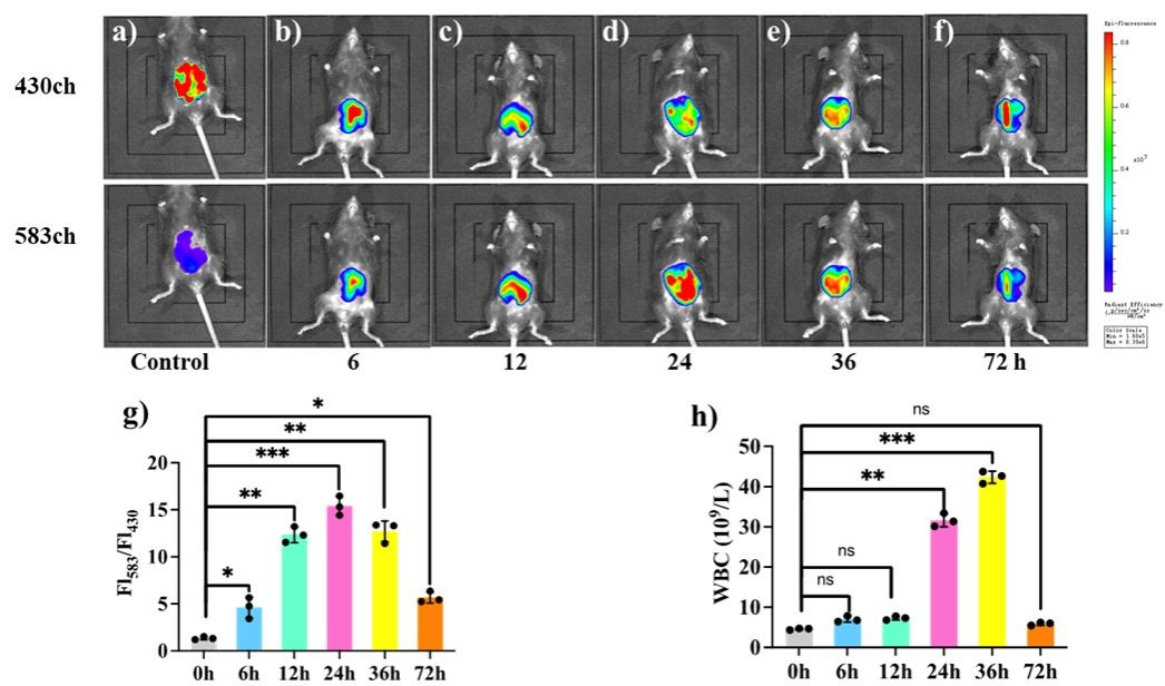 Figure 6. Fluorescence imaging of mice to monitor ONOO− during the Escherichia coli caused acute peritonitis. Mice were intraperitoneally injected with inactivated Escherichia coli (2 × 107 CFU), and after (a) 0, (b) 6, (c)12, (d) 24, (e) 36, (f) 72 h, HBT-Fl-BnB (50 μM, 200 μL) was injected through the tail vein. (g) Normalized average fluorescence intensity of Fl583/Fl430. 430ch: λem= 415-515 nm, 583ch: λem=550-650 nm. λex=405 nm. (h) Changes of WBC during acute peritonitis in mice. * P<0.05, ** P<0.01 *** P<0.001. The experiments were repeated three times and the data were shown as mean (±S.D.).