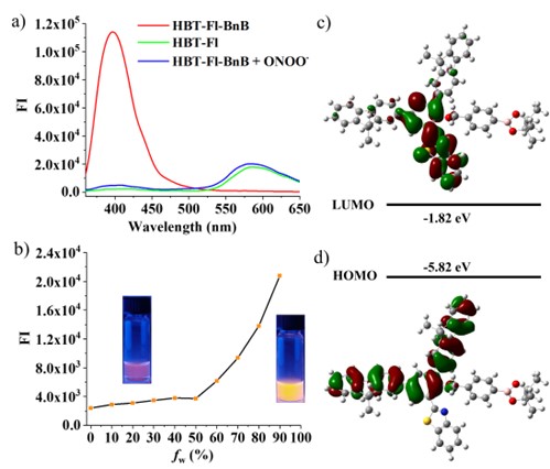 Figure 1. (a) Fluorescence spectra of HBT-Fl-BnB, HBT-Fl and HBT-Fl-BnB with excess ONOO− (10 μM, and 10 mM PBS buffer with 5% THF, 0.2% Tween, pH = 7.4, λex = 340 nm), and (b) the plot of fluorescent intensity of HBT-Fl (10 μM) at 584 nm vs. water fractions (%, fw) in the PBS buffer-THF mixture, λex = 360 nm; and (c,d) DFT calculations of the molecular frontier orbitals and energy levels of the Me derivative of HBT-Fl-BnB.