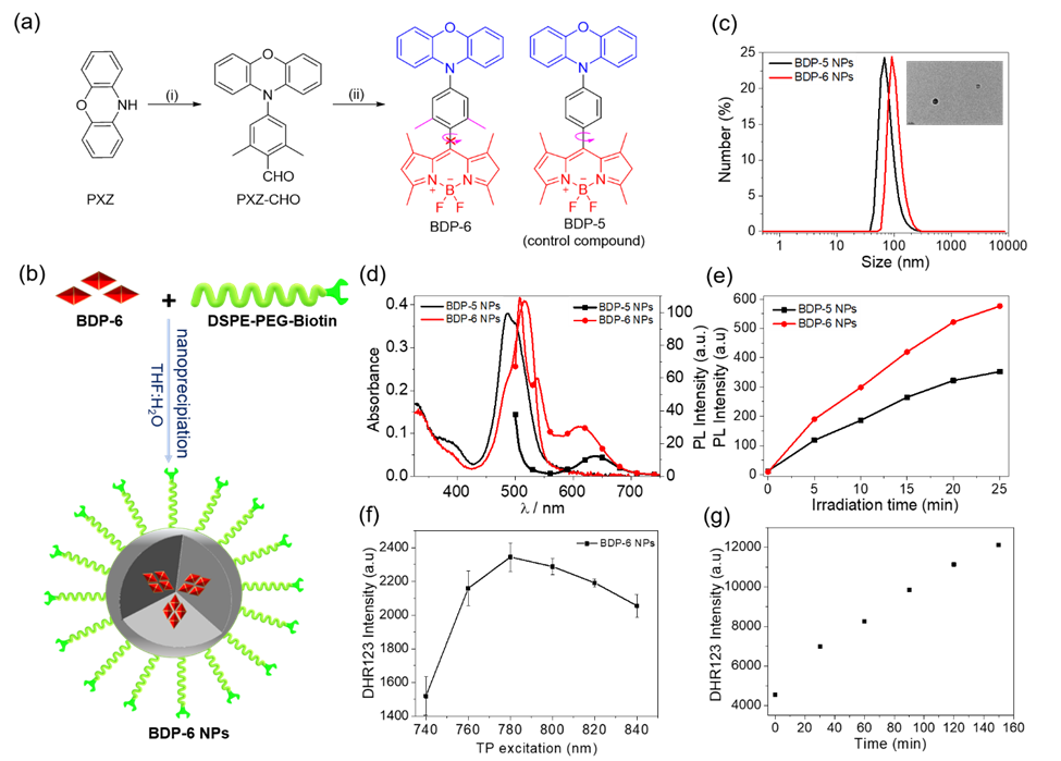 Figure 1. (a) Chemical structures and synthetic route of BDP dyes. (i) 4-bromo-2,6-dimethylbenzaldehyde, Pd(OAc)2, t-Bu3PHBF4 and K2CO3, toluene, reflux. (ii) DMF, POCl3. (iii) 2,4-dimethypyrrole, trifluoroacetic acid (TFA), p-chloranil, Et3N, and BF3.OEt2, CH2Cl2. (b) Schematic illustration for the preparation of BDP-6 NPs. (c) Nanoparticle size distribution of BDP PSs detected by DLS and TEM images (inset) of BDP-6 NPs. (d) UV-vis absorption and PL spectra of the BDP-5 NPs and BDP-6 NPs (10 µM, in water, lex = 490 nm). (e) ROS generation of BDP-5 NPs and BDP-6 NPs in water after irradiation by a green LED (20 mW/cm2) using DCFH-DA as ROS probe (lex = 500 nm, lem = 525 nm). (f, g) Two-photon ROS generation efficiency of BDP-6 NPs (10 µM). (f) A plot of fluorescence intensity of DHR123 (2.5 µM) with BDP-6 NPs according to the two-photon excitation wavelength. (g) A plot of fluorescence intensity for DHR123 with BDP-6 NPs against TP irradiation time at 780 nm (lex = 500 nm, lem = 525 nm).
