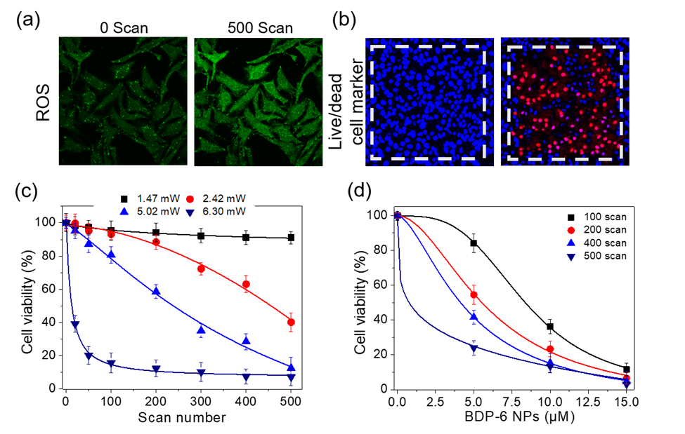 Figure 3. Fluorescence microscopy image of HeLa cells stained with BDP-6 NPs (5 µM) and (a) DCFH-DA (20 μM, ROS probe) or (b) Hoechst 33342/PI as indicators (2 µM/ 10 µM) followed by TP scans at 5.0 mW laser power. Scale bars = 50 µm. (c) Viability of cells incubated with BDP-6 NPs and irradiated at 780 nm at individual laser powers of 1.5, 2.4, 5.0, and 6.3 mW. (d) Cell viability estimated after 780 nm TP irradiation (6.3 mW).