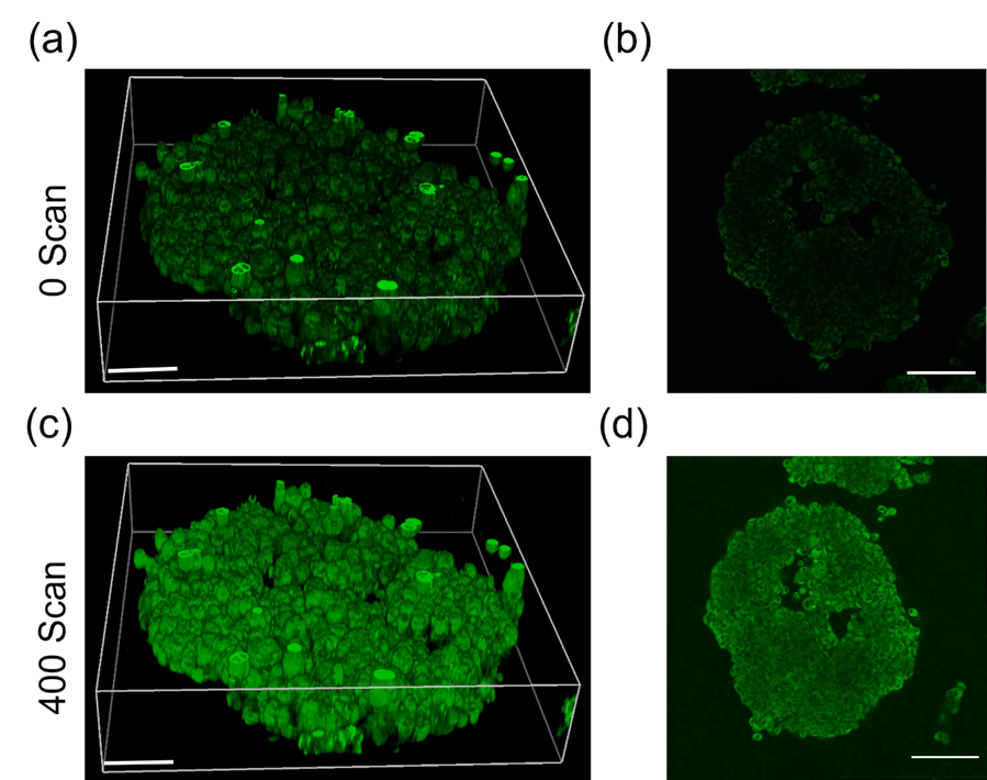 Figure 4. 3D image of HeLa spheroid ROS generation using ROS indicator DHR123. (a), (b) 3D images of HeLa spheroids incubated with DHR123 (15 µM) and BDP-6 NPs (100 µM) for 1 hour. (c), (d) Fluorescence images of HeLa spheroids incubated with DHR123 (15 µM) and BDP-6 NPs (100 µM) after 400 TP irradiation scans. Images were recorded in the 500-550 nm emission window after excitation at 488 nm. Scale bar = 50μm.