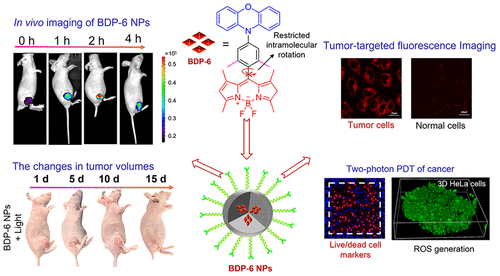 A novel heavy-atom-free BODIPY PSs (BDP-6) comprised of an electron-donating PXZ group and an electron-withdrawing BODIPY core was designed and synthesized for tumor-targeted two-photon photodynamic therapy. The photostable and biocompatible BDP-6 NPs were produced by encapsulating BDP-6 within DSPE-PEG(2000) biotin. Compared to BDP-5 NPs without dimethyl groups, BDP-6 NPs showed brighter emission in the deep red region and more efficient ROS production efficiency under one-photon excitation in aqueous solutions. The BDP-6 NPs could selectively accumulate in cancer cells and effectively kill cancer cells by generating intracellular ROS under green light illumination (one-photon) with low dark toxicity. Interestingly, upon two-photon excitation, the BDP-6 NPs efficiently generated ROS in both aqueous solution and living cells and consequently exhibited excellent 2PE-PDT performance toward cancer cells. In vivo, results demonstrated that BDP-6 NPs showed great potential for tumor-targeted fluorescence imaging and PDT treatment. This work provides a facile, straightforward methodology for developing highly efficient nanophotosensitizers for two-photon excited photodynamic therapy based on heavy-atom-free BODIPY platforms.