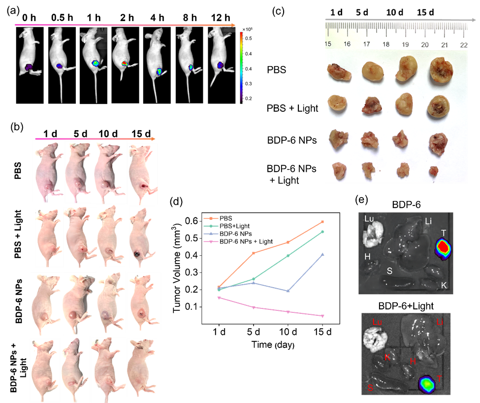 Figure 5. (a) In vivo imaging of BDP-6 NPs (intravenous injection, 10 μM, 100 μL in saline) in female nude BALB/c mice (λex = 490 nm, λem = 500-575 nm) at different time points of 0, 0.5, 1, 2, 4, 8, 12 h. (b) Visualization of BDP-6 NPs in the mouse breast cancer model. Photographs of untreated and PDT-treated mice models (660 nm, 200 mW/cm2, 15 min) for 1-15 days. The changes in tumor volume and weight. (c) Photographs of untreated and PDT-treated tumors within 15 days. (d) The analysis of tumor volume. (e) 2D ex vivo imaging in separated organs (tumor, heart, liver, spleen, lung, and kidney) sacrificed from mice models.