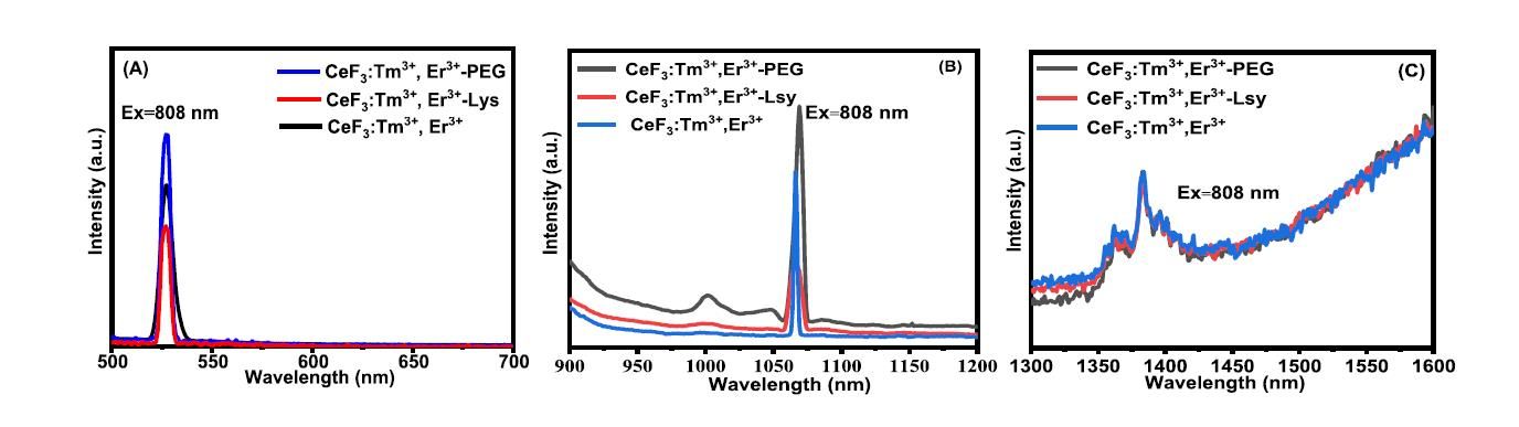 Fig. 13. Up-down conversion fluorescence spectra of CeF3:Tm3+, Er3+, CeF3: Tm3+, Er3+-PEG and CeF3:Tm3+, Er3+-Lys nanoparticles.