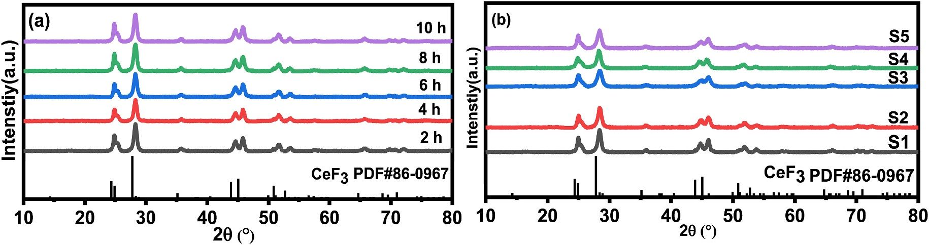 Fig. 2. XRD patterns of CeF3:Tm3+, Er3+ nanoparticles produced by hydrothermal method (a) and direct precipitation method (b).